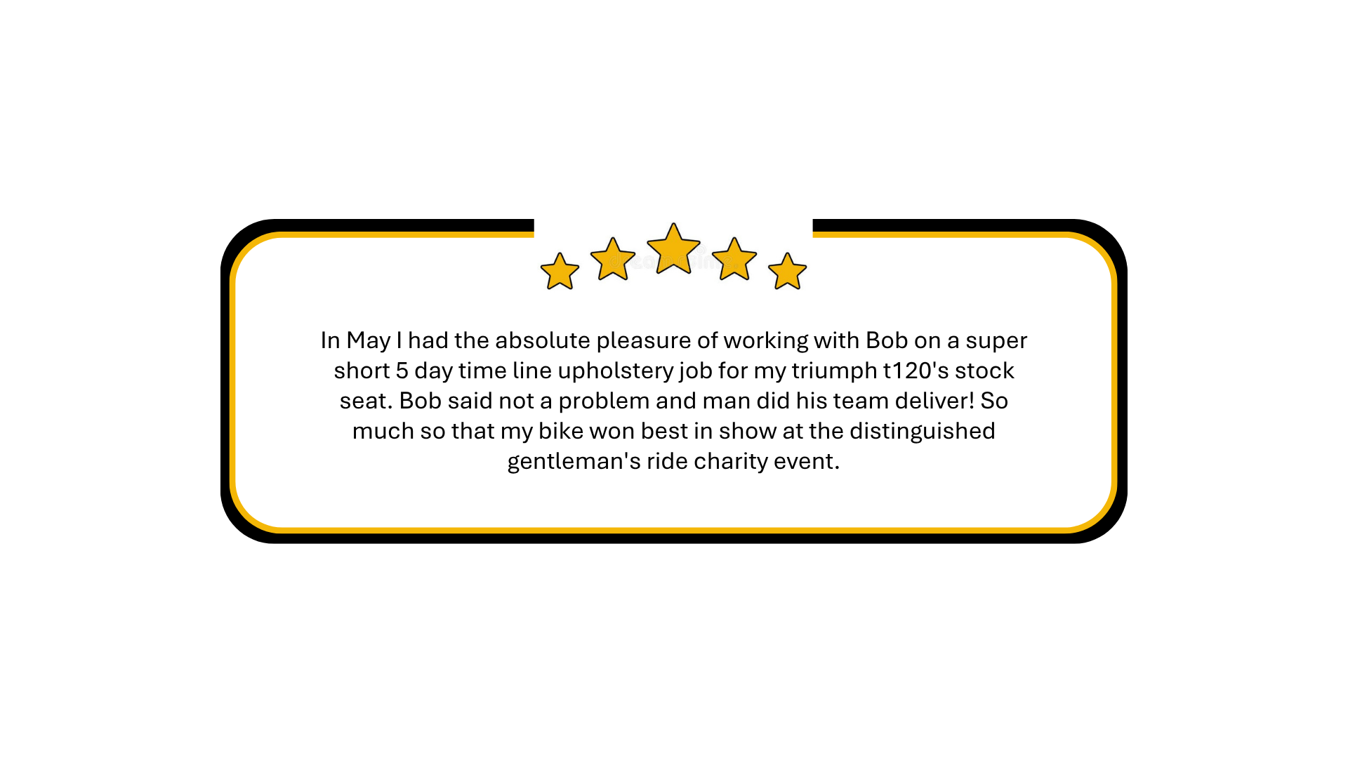 In May I had the absolute pleasure of working with Bob on a super short 5 day time line upholstery job for my triumph t120's stock seat. Bob said not a problem and man did his team deliver! So much so that my bike won best in show at the distinguished gentleman's ride charity event.