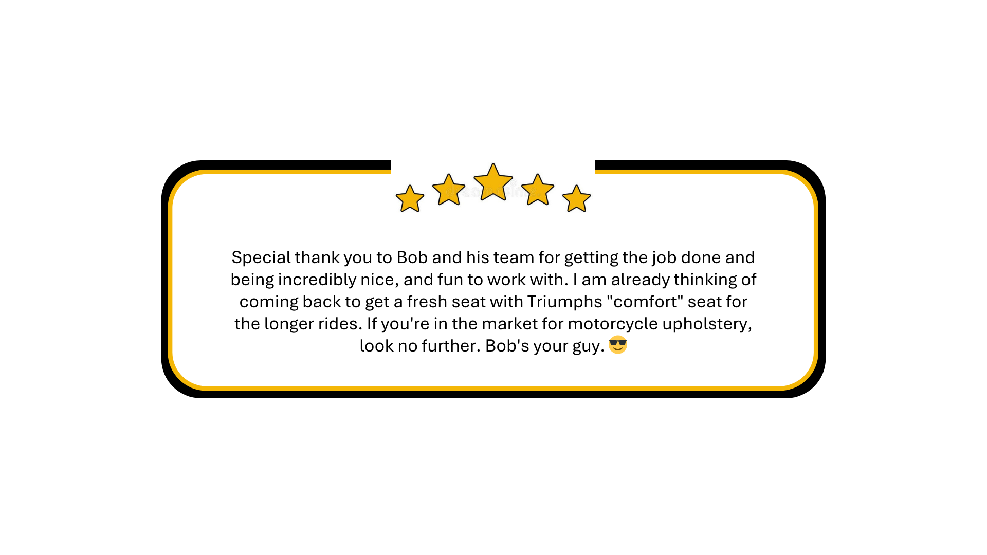 Special thank you to Bob and his team for getting the job done and being incredibly nice, and fun to work with. I am already thinking of coming back to get a fresh seat with Triumphs "comfort" seat for the longer rides. If you're in the market for motorcycle upholstery, look no further. Bob's your guy. 😎